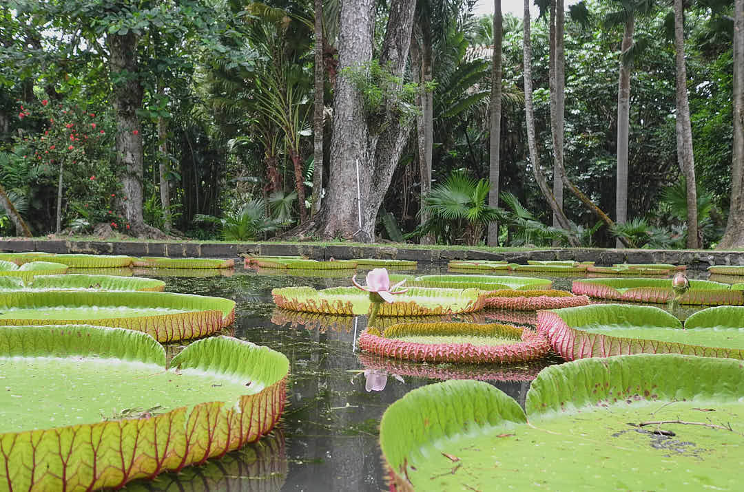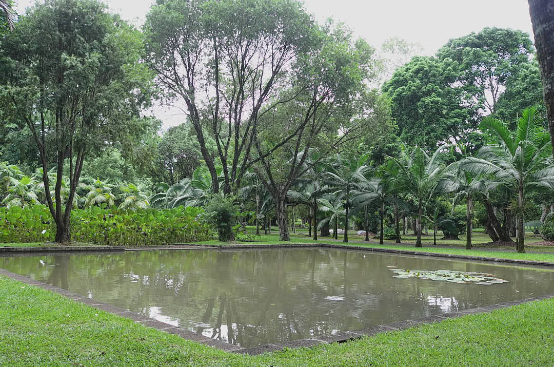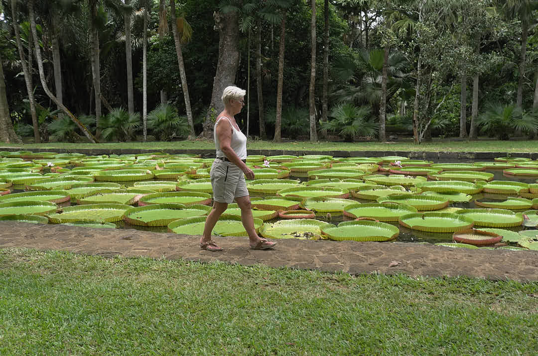 C’est une enfilade de Palmiers de tout genre, d’arbres à épices .Le bassin avec les nénuphars géants , dont le fleur éclos le matin et vire au violet le soir avant de faner.